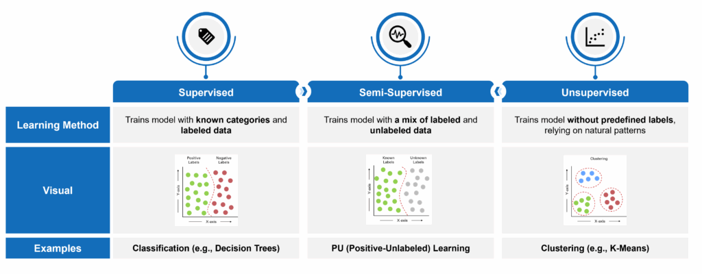 - Semi-Supervised: Leverages a combination of labeled and unlabeled data.