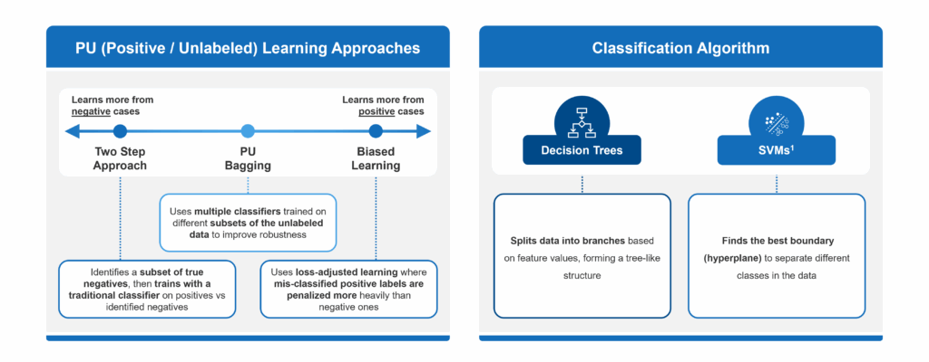 - Two-Step Methods: These methods attempt to correct for the drawbacks of Biased Learning by identifying a subset of reliable negatives before training a model. However, they can be highly sensitive to how those negatives are selected and may still overlook hidden positives.