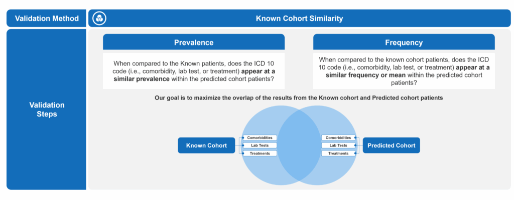 In the first approach, we analyzed the prevalence and frequency of key clinical markers, lab tests, and treatments – across both the known and predicted patient cohorts. Our goal was to maximize similarity between the two groups, under the assumption that a well-performing model would surface patients with clinical characteristics similar to those already diagnosed. We completed this by defining what constituted signification deviation from the predicted cohort to the known. Ultimately, we were able to pinpoint at what probability threshold the divergence from the known cohort became increasingly pronounced to establish a reasonable lower bound for inclusion.