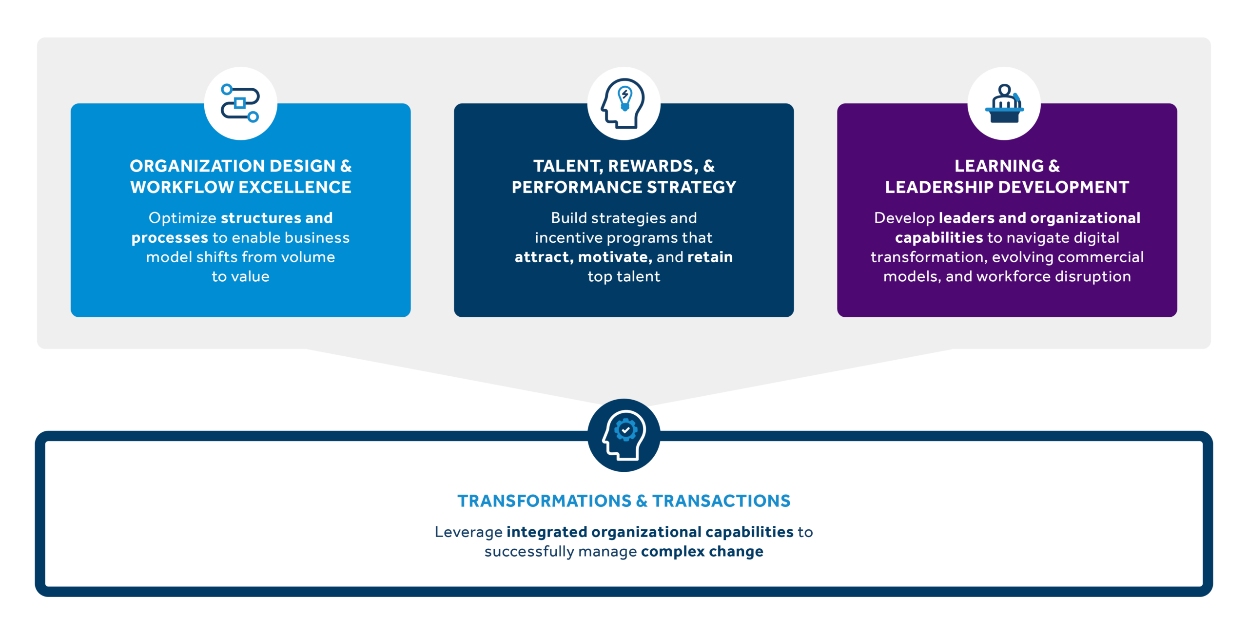 Design organizations and optimize workflows leveraging our Best Practice Organization framework. The goal is to create an organization with clarity, focus, and the capabilities needed to deliver against your strategic ambitions.
